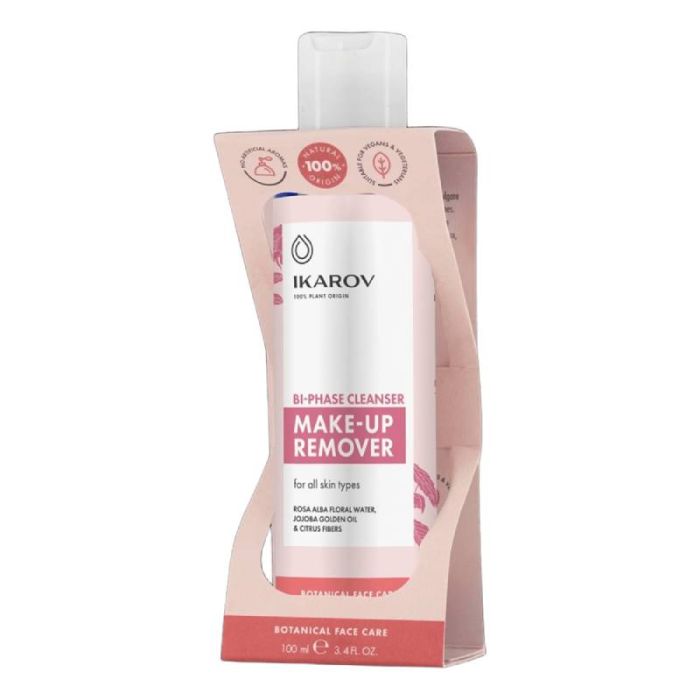 Ikarov Bi-phase Cleanser Make-up Remover е двуфазен лосион за почистване на лице, който съчетава флорална вода от българска бяла роза (Роза Алба), висококачествено масло от жожоба тип „Golden“ и натурални фибри, извлечени от цитрусови плодове. Формулата почиства кожата нежно, но в дълбочина, благодарение на активните растителни съставки. Лосионът ефективно отстранява всички видове грим, включително водоустойчив, като едновременно освежава и оставя усещане за комфорт. Икаров Двуфазен почистващ лосион за лице е подходящ за всеки тип кожа. След нанасяне кожата е тонизирана и освежена. Формулата не дразни очите, а маслото от жожоба подпомага подхранването и здравината на миглите. Със 100% натурален състав и рециклируема опаковка. Подходящ за вегани.