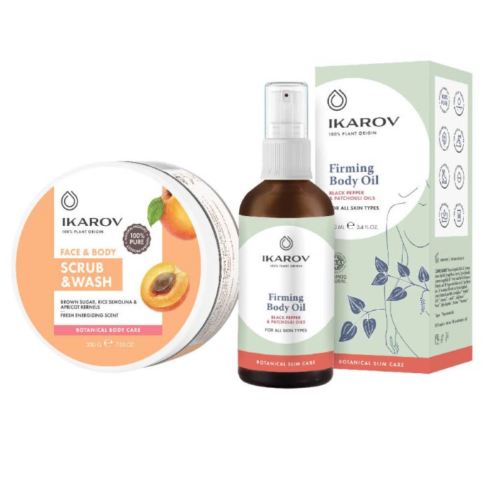Комплектът съдържа: Ikarov Измивен скраб за лице и тяло с кайсиеви трици 200 г 1 бр + Ikarov Стягащо масло за тяло 100 мл 1 бр.