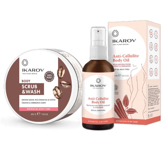 Комплектът съдържа: Ikarov Измивен скраб за тяло с кафе 200 г 1 бр + Ikarov Антицелулитно масло за тяло с екстракт от бразилски розов пипер и канела 100 мл 1 бр.