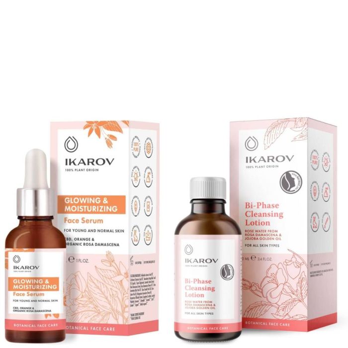 Комплектът съдържа: Ikarov Озаряващ и овлажняващ серум за лице 30 мл 1 бр + Ikarov Двуфазен почистващ лосион за лице 100 мл 1 бр.