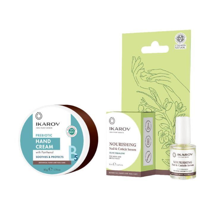 Комплектът съдържа: Ikarov Подхранващ серум за нокти и кожички 10 мл 1 бр + Ikarov Крем за ръце с пребиотик и пантенол 50 мл 1 бр.