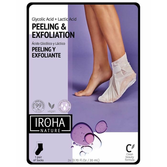 Iroha Nature Peeling & Exfoliatin Foot Mask маска за крака под формата на чорапи, която отстранява мъртвите клетки, омекотява грубата кожа и възвръща еластичността й. Има хидратиращ и антиоксидантен ефект. Подхранва и подобрява вида на стъпалата само след 10-14 дни. Ироха Нейчър Ексфолираща маска за крака с АНА и лавандула е подходяща за суха и загрубяла кожа. Чиста формула с 99 % естествени съставки, веган, без алергени, без парабени и без парфюми.