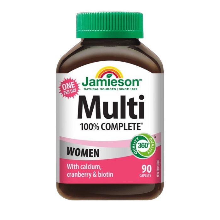 Jamieson Multi 100% Complete Women е разработена специално да отговаря на последните проучвания в областта на женското здраве. Джеймисън Мулти 100% Къмплийт Витамини за жени подкрепя физическото и психическото състояние на жената, подобрява метаболизма, влияе добре на костите, млечните жлези и уринарния тракт. Съдържа екстракт от боровинки, лутеин, ликопен и холин. Набавя 100% от дневната нужда на организма, тонизира и подпомага общото здраве.