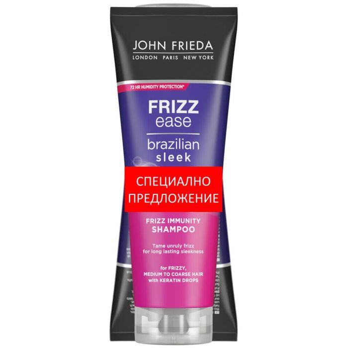 John Frieda Frizz-Ease Brazilian Sleek Shampoo е шампоан за мигновено и лесно изправяне, предназначен специално за чуплива, къдрава и непокорна коса. Специалната формула съдържа кератинови капки и Frizz Immunity Complex. Джон Фрида Фриз Ийзи Бразииан Слийк Шампоан за изправяне нежно почиства, бори се с начупването на косъма и гарантира изключителни резултати при оформянето на буйните и хвърчащи кичури в дълготрайно права и хидратирана прическа. След употреба косата е права, гладка и блестяща от корените до върховете. Продуктите от серията Brazilian Sleek са разработени на базата на иновативна технология, която успешно елиминира наелектризирането и хвърчащите краища като придава завършен и укротен вид както на права, така и на начупена коса. За по-ефективни резултати използвайте в комбинация с шампоан за лесно изправяне от същата серия John Frieda Frizz Ease Brazilian Sleek Conditioner. Без парабени. Дерматологично тестван продукт.