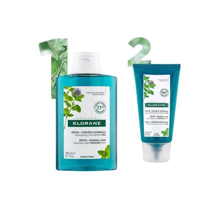 Комплектът съдържа: Klorane Детоксикиращ шампоан с екстракт от органична мента 200 мл 1 бр + Klorane Защитен детоксикиращ балсам с екстракт от водна мента 150 мл 1 бр.