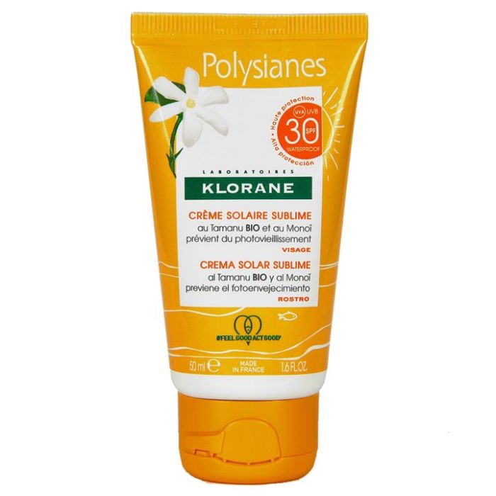 Klorane Polysianes SPF50+ Sublime Sun Cream е слънцезащитен крем за лице с органично масло от Таману и Монои, който осигурява защита срещу UV лъчите и фотостареене. Подхранва и предотвратява дехидратацията на кожата. Оставя озарен от слънцето разкрасяващ ефект. Клоран Полизиан SPF50+ Слънцезащитен крем за лице има водоустойчива и фотостабилна формула. Некомедогенна тесктура, която не оставя мазен филм. Придава бронзов загар и деликатен аромат на Гардения. Подходящ за всеки тип кожа. Без парабени. Дерматологично тестван продукт.