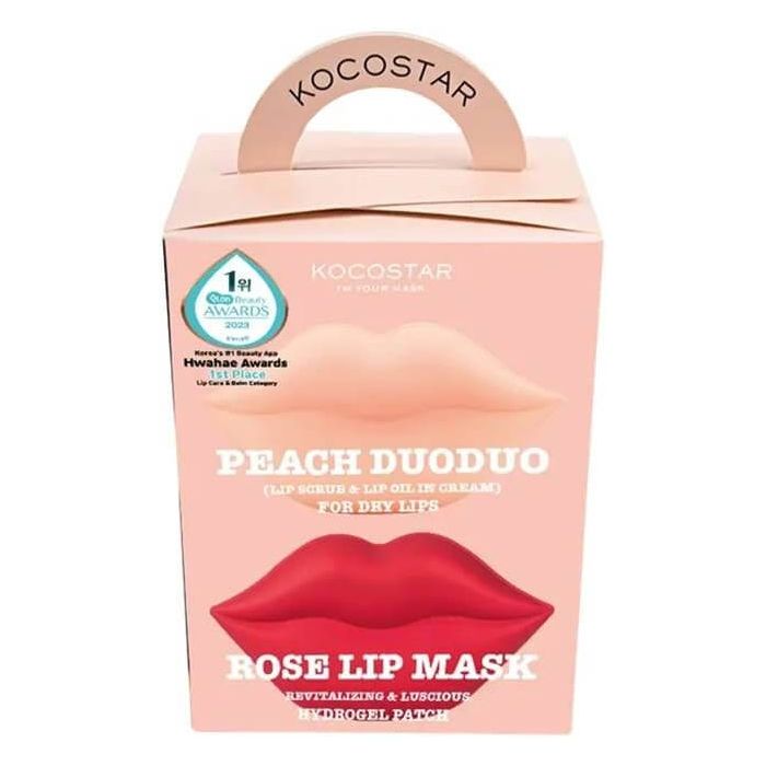Комплектът съдържа: Скраб и олио за устни Peach Duoduo: 43 г (скраб 23 г, олио 20 г) + маски Rose 20 бр.