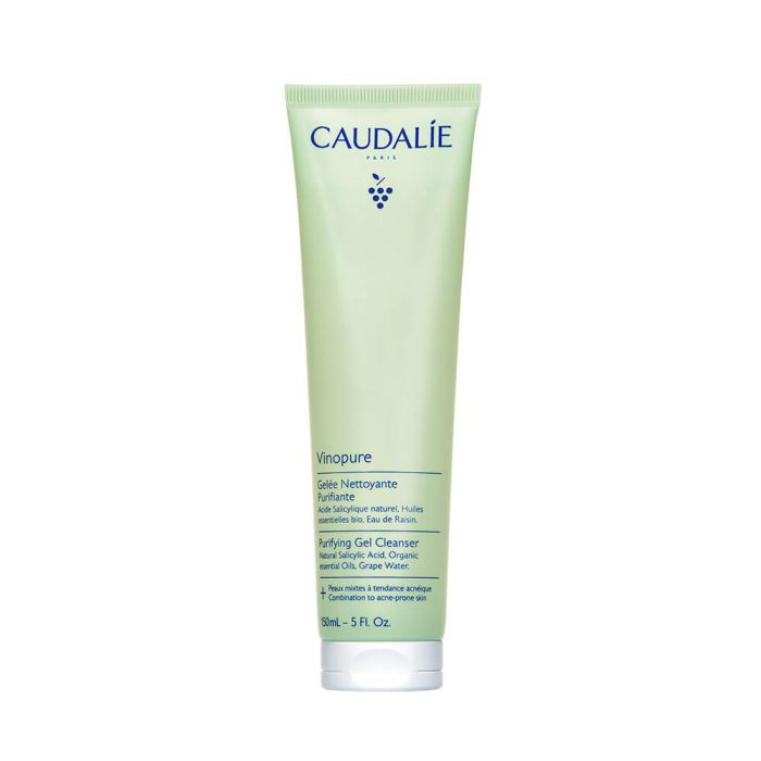 Caudalie Vinopure Purifying Gel Cleanser първа стъпка в рутината за мазна кожа, против несъвършенства. Почиства, стяга порите, намалява излишния себум, без да изсушава кожата. Кодали Винопюър Почистващ матиращ гел съдържа 99% съставки от натурален произход. Без сапун. Без алкохол. Некомедогенен. Не е фоточувствителен. Тестван под дерматологичен контрол. Веган. Без PEG. Без синтетичен аромат.