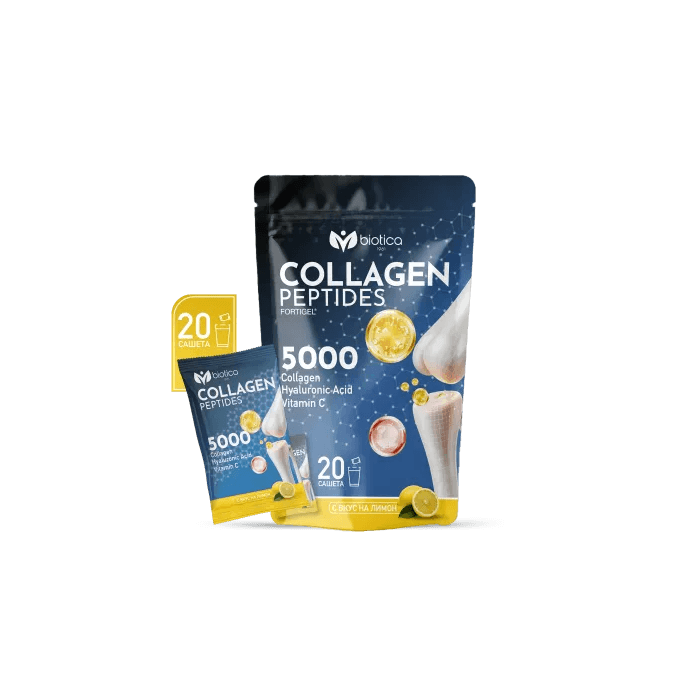 Collagen Peptides 5000 e високоефективна формула с хидролизиран телешки колаген под формата на колагенови пептиди, създадена специално за поддържане здравето на ставите, костите и съединителната тъкан. Всяка дневна доза осигурява 5000 mg колаген с висока бионаличност, комбиниран с хиалуронова киселина и витамин C за максимален ефект. 20 разтворими сашета на прах, подходящи за ежедневен прием. Със свеж вкус на лимон – без неприятния мирис и послевкус на стандартния телешки колаген.