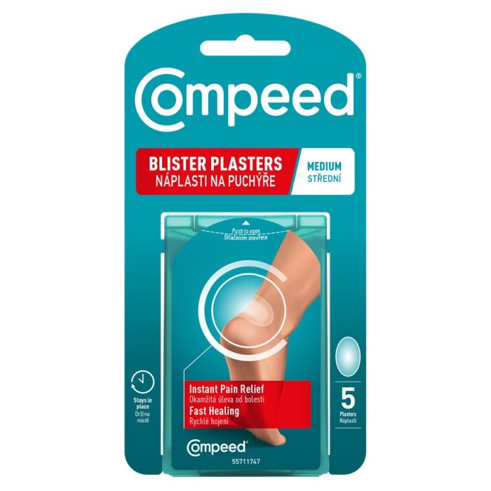 Compeed blister plasters Medium са тънки пластири за мехури, които бързо облекчават болката и ускоряват заздравяването чрез хидроколоидна технология. Предназначени за ежедневна употреба, те абсорбират влагата, създават защитен слой и остават здраво закрепени до няколко дни, предпазвайки от триене. Хидроколоидните частици в пластира попиват ексудата от раната и образуват гел, който спомага за по-бързо заздравяване. Компийд Пластир за мехури среден размер осигурява моментално облекчение, а скосените му краища прилягат плътно, намаляват триенето и предпазват процеса на заздравяване от прекъсване. Водоустойчиви и дишащи, те са почти незабележими след поставяне и гарантират необходимата дискретност. Подходящи за употреба при мазоли, водни мехури, мехури, пришки.