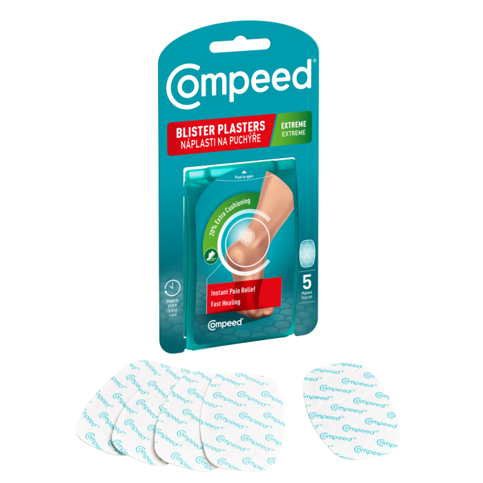 Compeed blister plasters Extreme са тънки пластири за мехури, които бързо облекчават болката и ускоряват заздравяването чрез хидроколоидна технология. Предназначени за ежедневна употреба, те абсорбират влагата, създават защитен слой и остават здраво закрепени до няколко дни, предпазвайки от триене. Хидроколоидните частици в пластира попиват ексудата от раната и образуват гел, който спомага за по-бързо заздравяване. Компийд Пластир за мехури Екстрийм осигурява моментално облекчение, а скосените му краища прилягат плътно, намаляват триенето и предпазват процеса на заздравяване от прекъсване. Водоустойчиви и дишащи, те са почти незабележими след поставяне и гарантират необходимата дискретност. Подходящи за употреба при мазоли, водни мехури, мехури, пришки. Структурата пластира - тип „пчелна пита“ осигурява 20% допълнително омекотяване при стъпване за оптимален комфорт и защита по време на движение.
