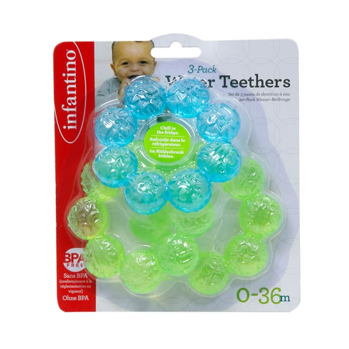 Infantino Комплект бебешки гризалки с вода успокояват нежните венци на бебето. Кръглият дизайн е лесен за хващане и държане от малки ръчички. Инфантино Комплект бебешки гризалки с вода могат да се охлаждат в хладилник. Комплект от 3 броя.