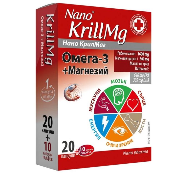 Nano KrillMg е хранителна добавка, подходяща за прием при: риск от сърдечно-съдови заболявания; артрозоартрити от различен произход; заболявания на нервната система; захарен диабет и профилактика на усложненията му; кожни заболявания; поражения на костите; язвена болест на стомаха; синдром на сухото око. Тя съдържа магнезий. Магнезият спомага за: намаляване на чувството на отпадналост и умора; за нормалното протичане на метаболизма и производството на енергия; за нормалния синтез на белтъци; за нормалното функциониране на нервната система. Омега-3, които също са част от състава на добавката, укрепват имунната система, подпомагат по-добрата памет, концентрация и здрав сън. Подкрепят организма в процеса на отслабване, допринасят за красива кожа и предпазват костите. Съдържа EPA и DHA в оптимално съотношение. Омега-3 подпомага по-доброто усвояване на магнезия от клетките. Съдейства за намаляване на нивата на холестерола и триглицеридите в кръвта. Нано КрилМаг спомага за поддържане на нормално кръвно налягане и намалява риска от сърдечно-съдови заболявания. Допълващият се ефект на магенезия и омега-3, високата бионаличност са едно от основните предимства на продукта.