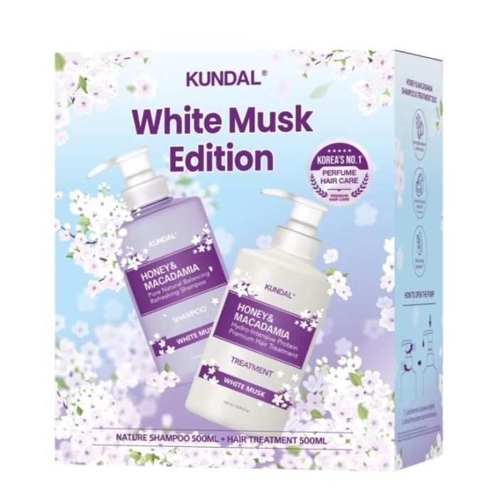Комплектът съдържа: Kundal Honey & Macadamia Shampoo White Musk Шампоан с мед, макадамия и аромат бял мускус 500 мл. 1 бр. + Kundal Honey & Macadamia Treatment White Musk Балсам с мед, макадамия и аромат бял мускус 500 мл. 1 бр.