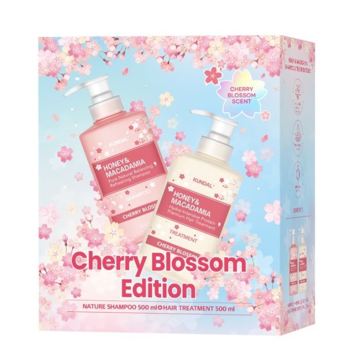 Комплектът съдържа: Kundal Honey & Macadamia Shampoo Cherry Blossom Шампоан с мед, макадамия и аромат череша 500 мл. 1 бр. + Kundal Honey & Macadamia Treatment Cherry Blossom Балсам с мед, макадамия и аромат череша 500 мл. 1 бр.