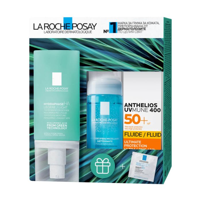 Комплектът съдържа: La Roche-Posay Hydraphase HA UV Лек хидратиращ крем за нормална и смесена кожа SPF25 50 мл 1 бр + Anthelios UVMune 400 Слънцезащитен флуид за лице за чувствителна кожа SPF50+ 15 мл 1 бр + La Roche-Posay Cleansing Мицеларна вода-пяна за чувствителна кожа 50 мл 1 бр + La Roche-Posay Cicaplast B5 Серум за дехидратирана и раздразнена кожа 2 мл 1 бр.