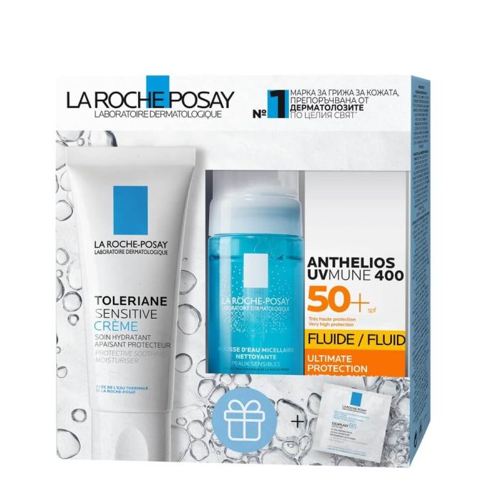 Комплектът съдържа: La Roche-Posay Toleriane Пребиотичен хидратиращ крем за чувствителна кожа 40 мл 1 бр + Anthelios UVMune 400 Слънцезащитен флуид за лице за чувствителна кожа SPF50+ 15 мл 1 бр + La Roche-Posay Cleansing Мицеларна вода-пяна за чувствителна кожа 50 мл 1 бр + La Roche-Posay Cicaplast B5 Серум за дехидратирана и раздразнена кожа 2 мл 1 бр.