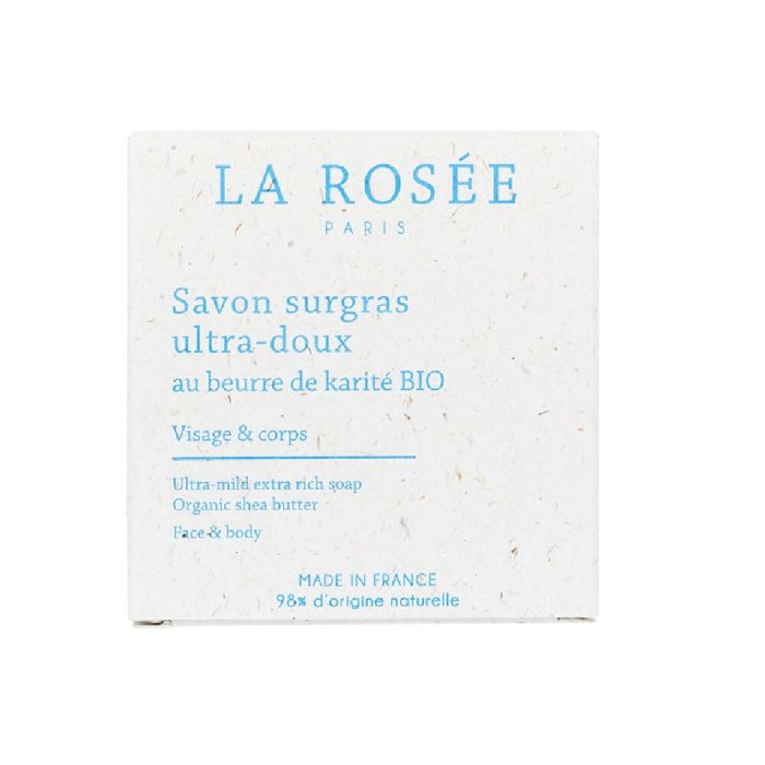 La Rosee Ultra-mild extra rich soap Organic shea butter е нежна измиваща формула обогатена с органично масло от карите и растителен глицерин. Тя създава богата, деликатна пяна с добри измивни качества, която запазва хидролипидният филм. Ла Росе нежен сапун с органично масло от карите е подходящ за всеки тип кожа, достатъчно фин за да се използва за почистване и на лицето. Притежава деликатен аромат на памук. Продуктът е подходящ за бременни жени. Веган формула в рециклируема опаковка. 98% биоразградим състав на продукта.