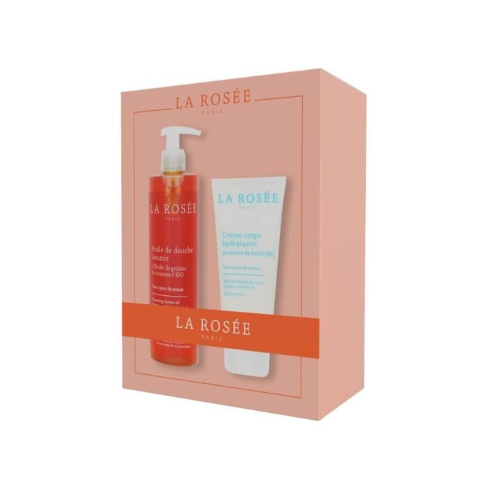 Комплектът съдържа: La Rosee Душ-олио с органично слънчогледово масло 400 мл 1 бр + La Rosee Хидратиращ крем за тяло с органично масло от карите 200 мл 1 бр.