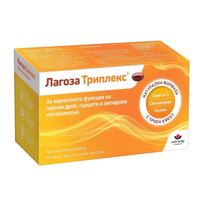 Lagosa Triplex е хранителна добавка със силимарин, омега-3 мастни киселини и холин. Лагоза Триплекс подпомага функциите на черния дроб, спомага за нормалния метаболизъм на липидите и предоставя важни омега-3 мастни киселини като EPA и DHA, които са от съществено значение за правилното функциониране на организма. Не съдържа глутен, захари и лактоза и може да се приема от хора с чувствителност към тези съставки или спазващи определени хранителни режими. Предлага се в опаковка от 40 меки желатинови капсули.