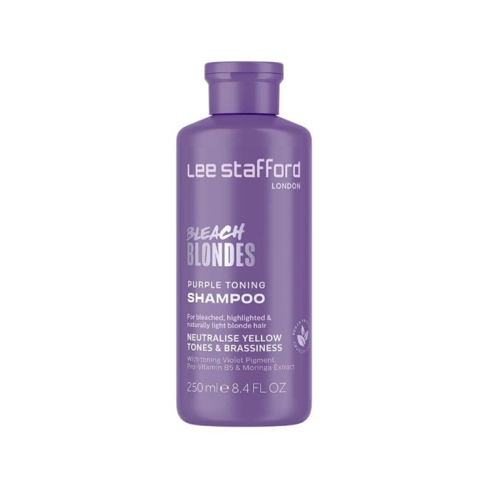 Lee Stafford Bleach Blondes Purple Toning Shampoo е тониращ шампоан, който съдържа мощен виолетов пигмент за неутрализиране на жълтите тонове. Формулата е обогатена с подхранваща комбинация от витамини и екстракти. Лий Стафорд Блийч Блондс Тониращ шампоан за коса е подходящ за всеки тип руса коса.