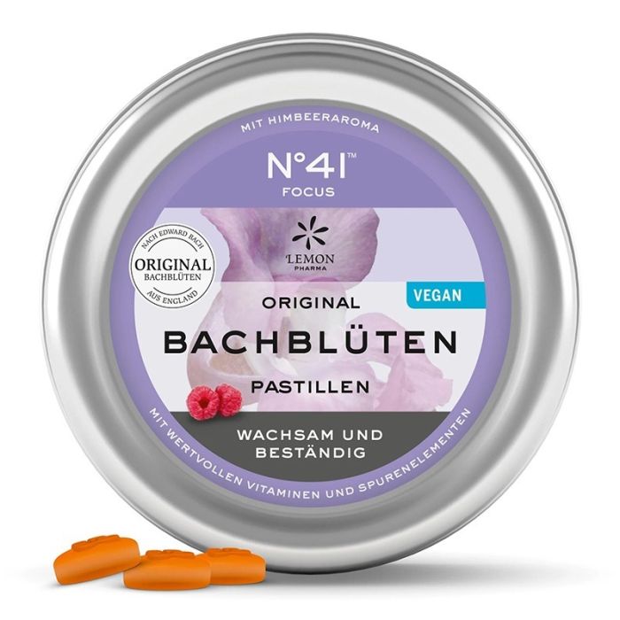 N41 Focus Pastillen са био пастили, които комбинират силата на природата с нуждите на съвременния човек. Създадени по оригиналния метод на д-р Бах, тези пастили предлагат цялостна подкрепа за умствена концентрация, психическа устойчивост и възстановяване на енергията в натовареното ежедневие. Формулата е изцяло без захар, съдържа био акациева смола, ценни витамини, микроелементи и подбрани цветни есенции на д-р Бах, включително шипка, маслина, габър и бряст, които действат на емоционално и когнитивно ниво. №41 Д-р Бах пастили Фокус спомагат за баланса межзу ума и тялото, подпомагайки бързото възстановяване от умствено натоварване и насърчавайки емоционалната стабилност и адаптивност. Съдържат пантотенова киселина, витамини B6, B12, C, фолиева киселина, йод, селен, мед и фибри.