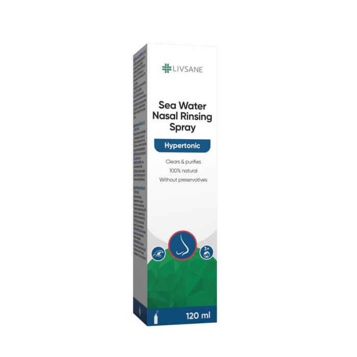 LIVSANE Хипертоничен спрей за промиване на нос с морска вода е деконгестантен разтвор, предназначен за прочистване и пречистване на носните проходи. Медицинското изделие силно хидратира носната кухина благодарение на механичното си промиване и извличане. Това поддържа носната лигавица отворена. Ливсейн Хипертоничен спрей за промиване на нос с морска вода е 100% натурален. С микроелементи. Без консерванти. Без пропелент.