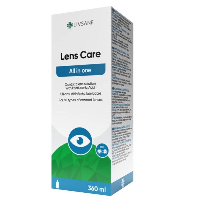Livsane Care All in one е комбинация от разтвор за почистване на лещи и подходящ за целта контейнер. Разтворът е подходящ за цялостна поддръжка на всички видове контактни лещи. Ливсане Разтвор и контейнер за контактни лещи има свойството да почиства, премахва белтъчни остатъци, хидратира и дезинфекцира. Контейнерът е подходящ и за съхранение на вашите контактни лещи.