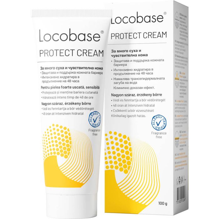 Locobase Protect Cream e е дермопротектор, предназначен за интензивна хидратация и защита на суха и чувствителна кожа, особено подходящ както през студените месеци, така и при повишена сухота на въздуха. Кремът създава защитен слой, който блокира изпарението на влагата, поддържайки кожата хидратирана и предотвратявайки изсушаването ѝ. Подходящ е за цялото семейство. Може да се използва за лице, ръце и тяло. Локобаза Протект Крем съчетава свойствата на крем и мехлем: има високо съдържание на вода и особено високо съдържание на липиди. По този начин образува защитна липидна бариера, като същевременно позволява на кожата да диша и предотвратява загубата на естествената ѝ влага. Препоръчва за много чувствителна и суха кожа и като допълнителен продукт за грижа за атопична кожа. Не съдържа оцветители и парфюми. С pH 4.0. Кремът се абсорбира бързо, не лепне и не оставя мазен филм по кожата.