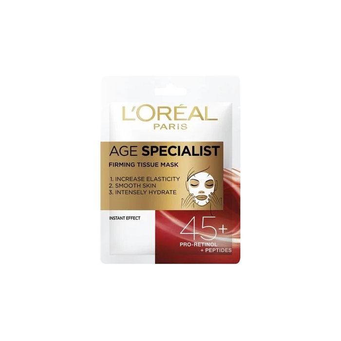 L’Oreal Age Specialist 45+ Firming Tissue Mask е хартиена маска за лице със стягащ ефект. Тя е лесна за използване по всяко време и навсякъде. Специалната формула на Л’Ореал Ейдж Специалист Хартиена маска за лице за стегната кожа 45+, с която е напоена, интензивно хидратира и възстановява кожата. Обогатена е с ретинол (витамин A), пептиди и хиалуронова киселина. Ретинолът има мощен антиоксидантен ефект, притежава овлажняващи и подхранващи свойства. Хиалуроновата киселина изглажда, хидратира и подобрява плътността на кожата. Вложените пептиди действат подмладяващо, регенериращо и овлажняващо. Формулата, специално разработена за зряла кожа, помага да се намалят фините линии и дълбочината на бръчките. Тя подобрява баланса на влага в кожата, оставя я сияйна, еластична и тонизирана. Дерматологично тестван.