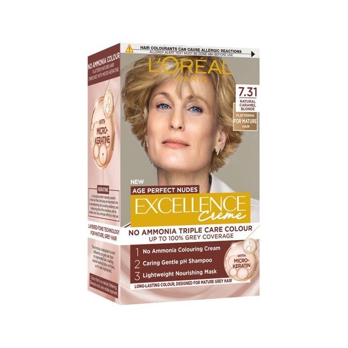 L'Oreal Excellence Creme Age Perfect Nudes е безамонячна боя за коса иновативна безамонячна боя, създаден специално за зрялата и посивяла коса. Боята е разработена по иновативна технология на пластовете, която поддържа хармоничен контраст с пигментираната коса и създава естествено изглеждащи светли и тъмни тонове, сякаш косата е на кичури – за мек, равномерен и подмладяващ резултат, който не подчертава израстналите корени. Формулата е нежна към скалпа и осигурява до 100% покритие на белите коси. Обогатена е с микрокератин, който укрепва структурата на косъма, подобрява неговата устойчивост, повишава еластичността и придава повече блясък. Лореал Екселънс Ейдж Перфект Безамонячна боя за коса има приятен аромат и се предлага в естествени цветове, които прилягат на всеки тон кожа. В комплекта са включени специален шампоан с нежно pH и маска, която подхранва косъма след боядисването.