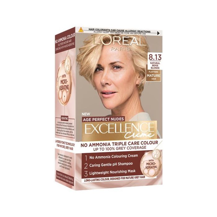 L'Oreal Excellence Creme Age Perfect Nudes е безамонячна боя за коса иновативна безамонячна боя, създаден специално за зрялата и посивяла коса. Боята е разработена по иновативна технология на пластовете, която поддържа хармоничен контраст с пигментираната коса и създава естествено изглеждащи светли и тъмни тонове, сякаш косата е на кичури – за мек, равномерен и подмладяващ резултат, който не подчертава израстналите корени. Формулата е нежна към скалпа и осигурява до 100% покритие на белите коси. Обогатена е с микрокератин, който укрепва структурата на косъма, подобрява неговата устойчивост, повишава еластичността и придава повече блясък. Лореал Екселънс Ейдж Перфект Безамонячна боя за коса има приятен аромат и се предлага в естествени цветове, които прилягат на всеки тон кожа. В комплекта са включени специален шампоан с нежно pH и маска, която подхранва косъма след боядисването.