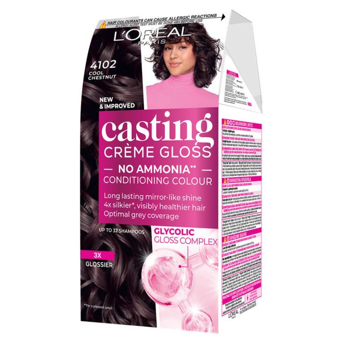 L'Oreal Casting Creme Gloss 4102 Cool Chestnut е висококачествена боя за коса без амоняк. Лореал Кастинг Крем Глос Боя за коса без амоняк 4102 Студено кестеняво перфектно покрива белите коси и другите цветове. Продуктът връща естествения блясък на косата, като тя става 4 пъти по-блестяща. Резултатът от боядисването е естествен и дълготраен. Боята е добър избор при боядисване за първи път, при първите бели коси, при желание да смените цвета на косата. Продуктът обагря косата в преливащи нюанси. В същото време възстановява и освежава изцяло цвета. Съдържа и подхранващ комплекс, който защитава косъма за дълго време. Формулата е обогатена с пчелно млечице за мека и копринена коса. Боята е с приятен аромат. След боядисването подхранващият балсам с пчелно млечице подхранва косъма и обновява блясъка на цвета до следващото боядисване. За всеки тип коса.