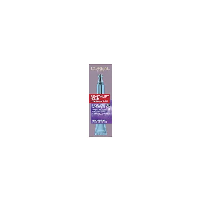 L'Oreal Revitalift Filler HA Replumping Eye Cream е околоочен крем против стареене с хиалуронова киселина, който намалява видимостта на фините линии и възвръща загубения обем на кожата в зоната около очите. Подходящ за всеки тип кожа. Специалната формула съдържа хиалуронова киселина, която притежава подмладяващи, тонизиращи и противовъзпалителни свойства. Тя интензивно хидратира, изглажда и омекотява кожата. Вложени в състава са още глицерин, който действа овлажняващо и антисептично и витамин Е, който има антиоксидантни, регенериращи и подмладяващи свойства. Добавеният аденозин помага за възстановяване и изглаждане на кожата, a кофеинът я тонизира и регенерира. Лoреал Ревиталифт Филър Околоочен крем против стареене с хиалуронова киселина притежава иновативен прецизен апликатор, с който можете да масажирате контурите на очите. Без парабени. Дерматологично и офталмологично тестван продукт.