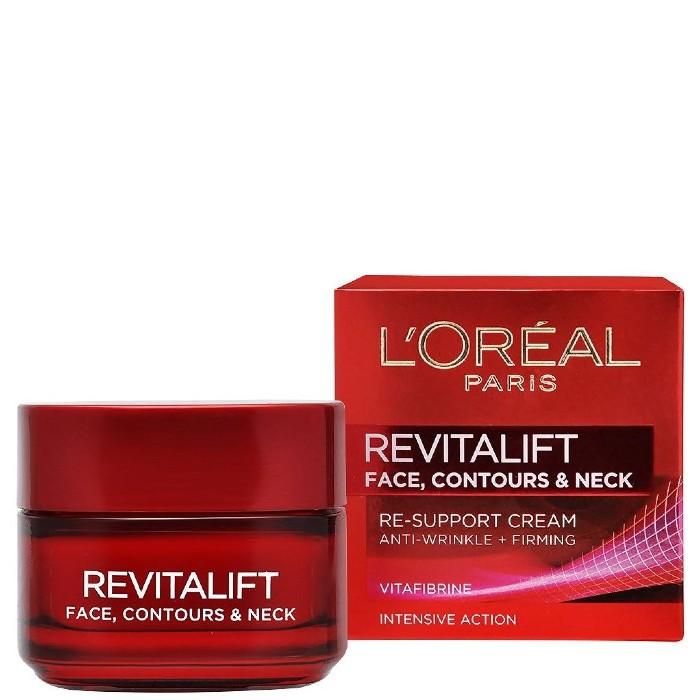 L'Oreal Revitalift Face, Contours and Neck e специално създаден крем, който има укрепваща грижа против бръчки и осигурява стягане на кожата. Мощната му формула съдържа активните съставки Vitafibrine и Pro-Retinol A, които помагат при запазването на контурните линии на лицето и намаляват бръчките по шията. Лореал Ревиталифт Крем Против Бръчки за лице, контур и шия, изглажда съществуващите бръчки и намалява появата на нови, като подобрява плътността и еластичността на кожата. След употреба на крема, кожата се чувства по-стегната и дори дълбоките бръчки по шията са видимо намалени, а контурите на лицето изглеждат по-определени. Дерматологично тестван.