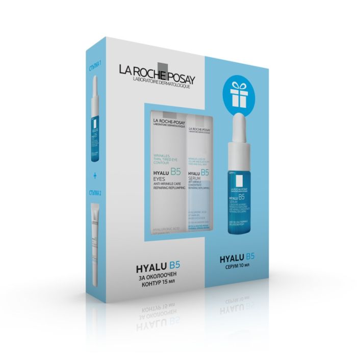 Комплектът съдържа: La Roche-Posay Hyalu B5 Околоочен крем против бръчки за чувствителна кожа 15 мл 1 бр + La Roche-Posay Hyalu B5 Интензивен хидратиращ серум против бръчки за чувствителна кожа 10 мл 1 бр.