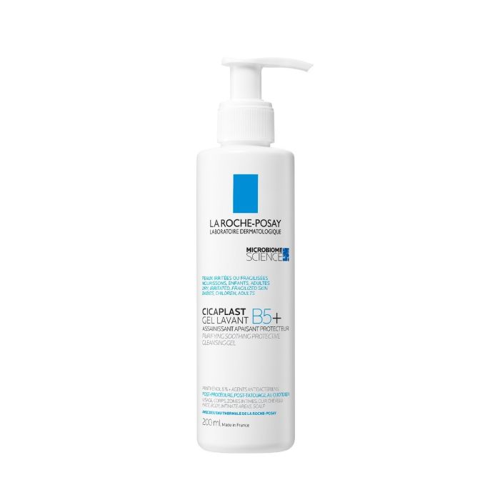 La Roche-Posay Cicaplast Lavant B5+ Purifying Soothing Protective Cleansing Gel е лека формула за суха и раздразнена кожа с успокояващо, възстановяващо и защитно действие. Благодарение на специално разработената си формула, този измиващ гел почиства кожата изключително деликатно, като едновременно я успокоява и намалява усещането за раздразнение. Осигурява интензивна хидратация и активно подпомага възстановяването на кожната бариера, като предлага надеждна защита от външни агресори. Подходящ е за цялото семейство, включително за използване след татуировки или в периоди на възстановяване на кожата след повърхностни процедури. Ла Рош-Позе Цикапласт Б5+ Почистващ и успокояващ гел не предизвиква изсушаване, не дразни очите и е с физиологично pH, без сапун и без аромат, което го прави подходящ дори за най-чувствителната кожа. С оптимална толерантност, подходящ е за лице, тяло и скалп.