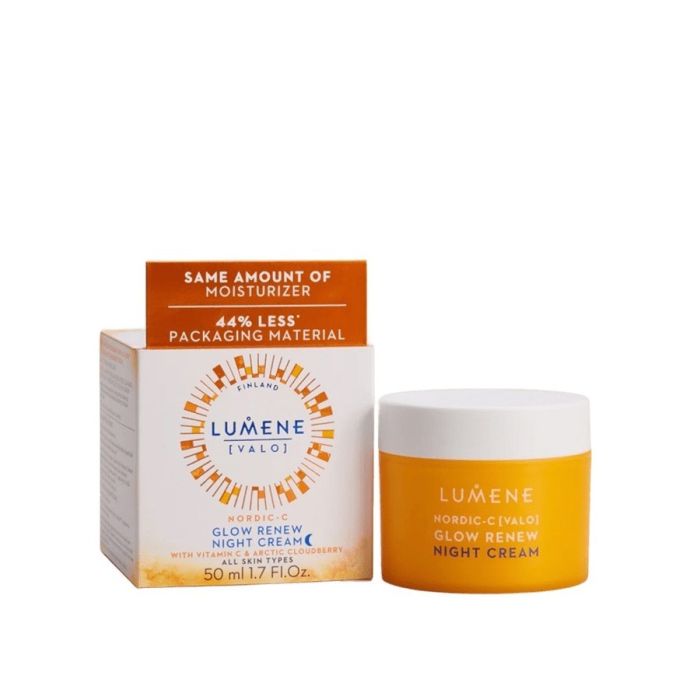 LUMENE NORDIC-C (Valo) Glow Renew Night Cream и интензивна формула за сияние и блясък. Формулирана с витамин С, B3, E и провитамин A, екстракт от Арктическа боровинка и арктическа термална вода, тя е богат на антиоксиданти и полезни за хоржата подхранващи вещества. Обогатена с хиалуронова киселина и полиглутаминова киселина за максимален блясък и хидратация. ЛУМЕНЕ ВАЛО Нощен крем-маска за блясък и сияние с витамин Ц спомага за възстановяване на текстурата на кожата, за нейната регенерация и мекота, като я защитава от влиянието на свободните радикали. Освежава и озарява.