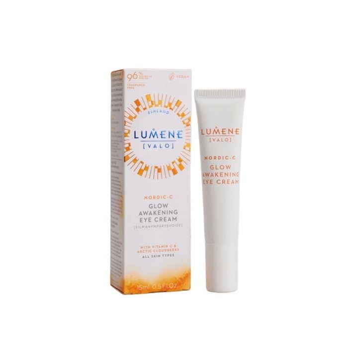 LUMENE NORDIC-C (VALO) All-in-One Eye Treatment е околоочен крем за блясък и сияние, който хидратира, енергизира и намалява признаците на умора, тъмните кръгове и подпухналостта, като осигурява по-сияен и свеж вид. Формулата е богата на антиоксиданти благодарение на включените в състава дива арктическа боровинка и витамин C. Комбинацията от хиалуронова киселина и полиглутаминова киселина спомага за дълбока хидратация и подчертава естествения блясък и сияние на кожата. ЛУМЕНЕ НОРДИК - Ц ВАЛО Околоочен крем е с лека текстура и е подходящ за вегани.