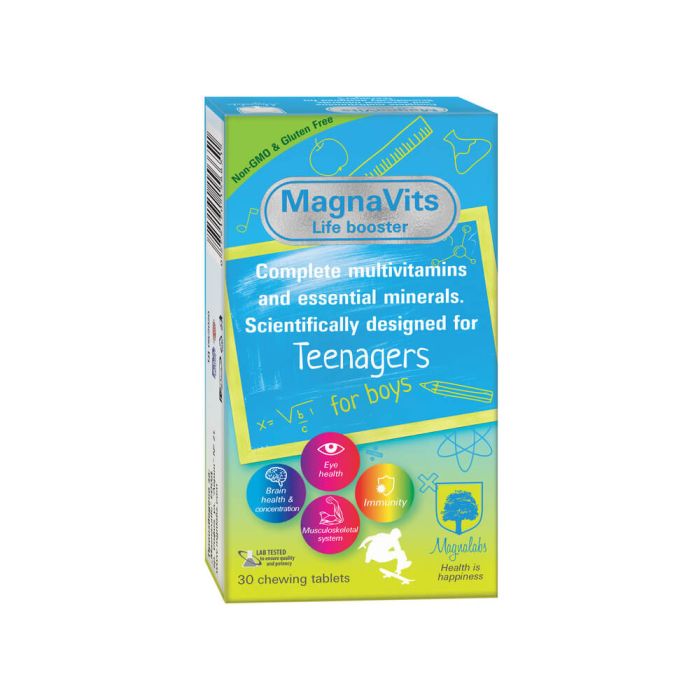 MagnaVits for Teenage Boys Magnalabs за тийнейджъри момчета е хранителна добавка, насочена към деца от 12 до 18 години. Тази научно разработена формула съдържа мултивитамини и минерали, целящи поддържане на имунната система, концентрацията и когнитивните способности, добро зрение и здрава опорно-двигателна система. Магнавитс за тийнейджъри момчета Магналабс е създаден, за да помогне на подрастващите в периода на пубертет, където организмът претърпява интензивен растеж и развитие. Комбинацията от мултивитамини и минерали има няколко предимства: Подпомагане на имунната система: Витамини като A, C, E, K, D3 и група B, заедно с минералите цинк, йод и селен, са от ключово значение за правилното функциониране на имунната система. Подкрепа на развитието на мозъка: Витамините от група B, антиоксидантите и минералите като цинк играят важна роля в развитието на мозъка и подпомагат паметта и концентрацията. Защита на зрителния апарат: Витамините A и E, заедно с антиоксидантите, предпазват очите от свободните радикали и поддържат здравето на зрението. Подсилване на опорно-двигателната система: Минералите калций и витамин D3 са важни за здравите костите и мускули. Поддържане на баланс в организма: Мултивитамините помагат да се запълнят хранителните пропуски, които могат да възникнат поради интензивния растеж и развитие през периода на пубертет. Важно е да се отбележи, че приемът на мултивитамини трябва да бъде в съответствие с инструкциите за дозиране, предоставени от производителя, и съгласно препоръките на здравния специалист.