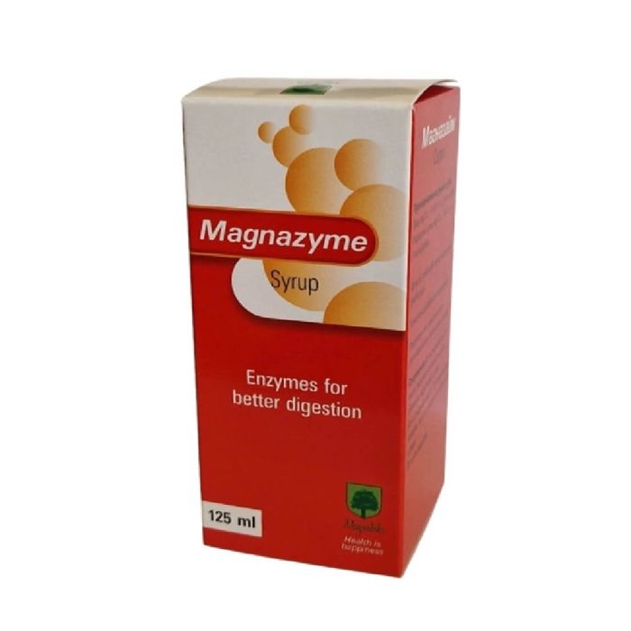 Magnazyme syrop е хранителна добавка, която подпомага храносмилането. Съдържа ензими и пробиотични бактерии, които повлияват положително храносмилателния процес, облекчават усещането за тежест и подуване след хранене. Допринася за баланса на чревния микробиом. Специално подбраните съставки създават защитена среда, която позволява на пробиотиците и ензимите да достигнат невредими до червата и ги предпазва от стомашната киселина. Магнезайм сироп е подходящ за деца над 3 години и възрастни.