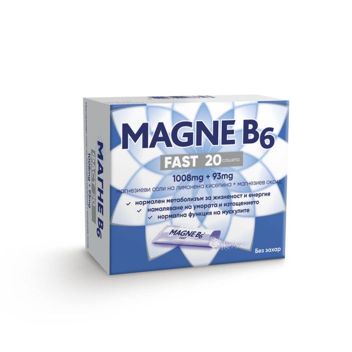 Magne B6 Fast е хранителна добавка с магнезиев цитрат и витамин Б6, която предотвратява мускулни крампи, намалява умората и изтощението и подпомага енергийния метаболизъм. Магнезиевият цитрат се усвоява лесно, а Витамин B6 допринася за енергийния метаболизъм, което го прави подходящ за хора с повишени физически и психически натоварвания, както и при дефицит на магнезий. С освежаващ цитрус вкус. Магне Б6 Фаст е под формата на сашета за директен прием.