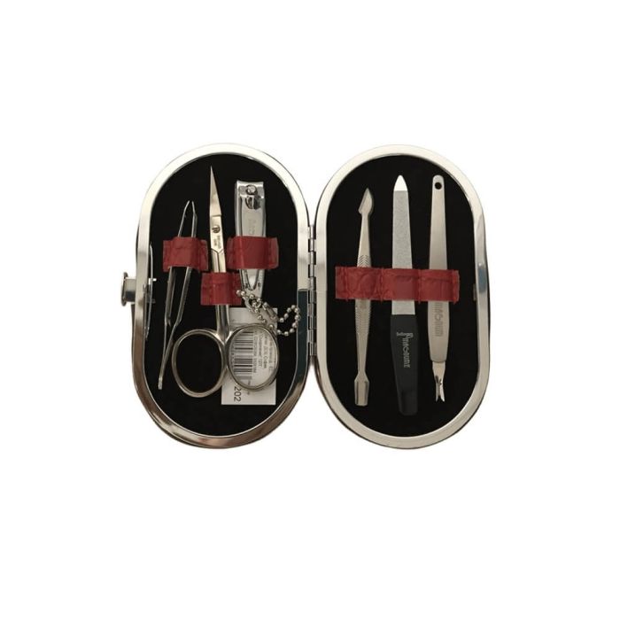 Magnum Feel the Style 202 Комплект за маникюр и педикюр кроко овален представлява стилен несесер с всички необходими инструменти за поддържането на перфектни маникюр и педикюр у дома. Магнум Фийл дъ Стайл 202 Комплект за маникюр и педикюр кроко овален се предлага в различни цветове и съдържа 6 оригинални инструмента за маникюр и педикюр Солинген. В несесера ще откриете нокторезачк, ножичка за кожички, комбиниран инструмент за кожичките, едностранен инструмент за премахване на кожички, пинсета - подходяща както за косъмчетата на пръстите на краката, така и за веждите и други окосмени места от тялото, пила за нокти. Несесерът е изключително практичен, тъй като е малък и лек, което го прави лесен за побиране в дамската чанта и за пренасяне. Освен това се отличава със здрав корпус, направен от висококачествена никелирана стомана. Разполага и с механизъм за заключване, който предпазва от отварянето му в чантата. Несесерът се предлага опакован в стилна кутия, което го прави много подходящ за подарък.