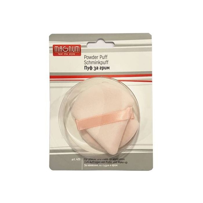 Magnum 420 Пуф за грим е чудесно решение за нанасяне на грим и пудра. Пуфът е изключително нежен и мек, позволява бързо и леко нанасяне. Формата му позволява да достигнете лесно до гънките в зоната на очите и около носа. Магнум 420 Пуф за грим се поддържа лесно, почиства се със сапун и вода.