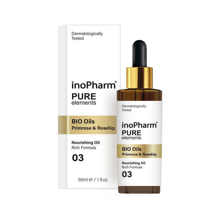 InoPharm Pure Elements Nourishing oils with Bio oils from rosehip and primrose е подхранващо масло за лице и шия с био масла от вечерна иглика, шипка и витамин Е. Маслото от шипка хидратира, забавя процесите на стареене, стимулира естествената регенерация на кожата и запазва свежия й вид за по-дълго време. Вечерната иглика придава еластичност, засилва естествената защитна функция на кожата и повишава нивата на влага. Добавеният витамин Е омекотява, придава еластичност. Инофарм Пюр Елементс Подхранващо масло за лице и шия с био масла от вечерна иглика, шипка и витамин Е е подходящо за всеки тип кожа. Дерматологично тестван.