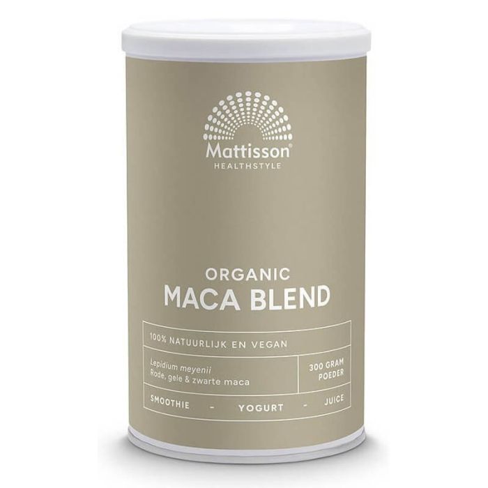 Mattisson Biologische Maca Poeder Blend е био смес от три вида мака: червена, жълта и черна, под формата на прах. Мака е кореноплодно растение, произхождащо от високите части на Андите в Перу, което расте при екстремни климатични условия на голяма надморска височина. Традиционно е използвана в местната култура като хранителен източник с висока стойност. Коренът на мака е богат на фибри, витамини и минерали, включително витамин C, желязо и калий, както и на растителни съединения като полифеноли. Счита се за адаптоген, растение, което подпомага организма да се адаптира към физически и психически натоварвания и да поддържа вътрешен баланс. Маката се използва традиционно за повишаване на енергията и издръжливостта, както и за поддържане на нормалната функция на хормоналната система. Подходяща е за хора с активен начин на живот и може да се включва в ежедневното хранене като добавка към смутита, напитки или храни. Жълтата мака е най-разпространената и често използвана форма. Червената мака се свързва с по-високо съдържание на растителни антиоксиданти, а черната мака е по-рядка и традиционно се асоциира с физическа издръжливост и концентрация. Матисън Био мака червена, жълта, черна има естествен лек карамелен вкус и се комбинира добре с какао и различни напитки. Подходящ е като част от балансиран хранителен режим.Подходяща за вегани.
