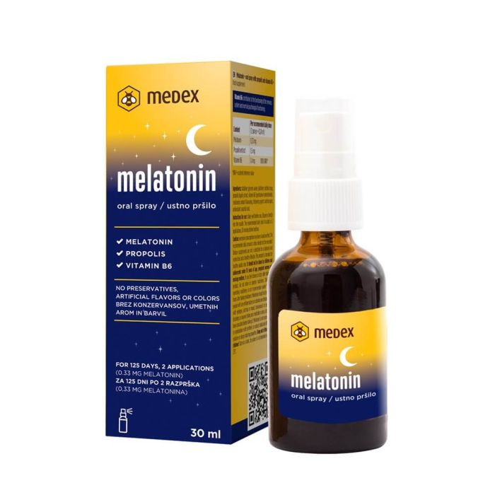 Medex Propolis мелатонин спрей е хранителна добавка за подпомагане на заспиването и доброто качество на съня. Формулиран с прополис, витамин В6 и маточина, той съдържа ниска концентрация мелатонин, каквато обичайно присъства в човешкия организъм през нощта. По този начин вероятността да доведе до прекомерна сънливост или до нежелани ефекти е силно ограничена. Спомага за успокояване на нервната система. Медекс Прополис мелатонин спрей не съдържа оцветители и консерванти.