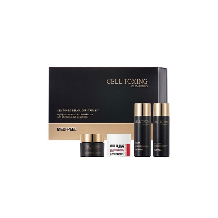 Комплектът включва: Medi-Peel Cell Toxing Dermajours Toner 30 мл. 1 бр. + Medi-Peel Cell Toxing Dermajours Emulsion 30 мл. 1 бр. + Medi-Peel Cell Toxing Dermajours Cream 10 г. 1 бр. + Medi-Peel Premium Naite Thread Neck Cream 10 г.