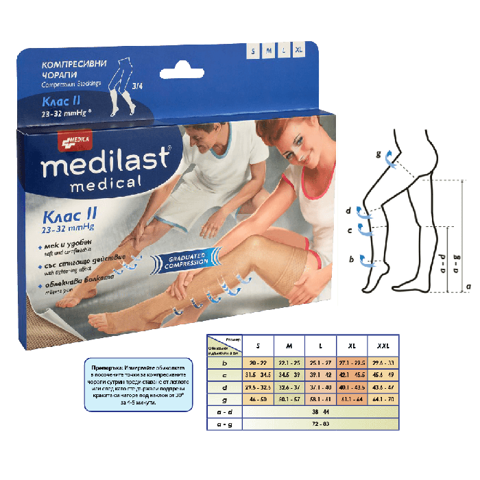 Medica Medilast Medical Компресивeн чорап 3/4 Размер Клас 2 L 1 бр са висококачествени медицински компресивни чорапи клас II, размер Л. Медика Медиласт Медикъл Компресивeн чорап 3/4 Клас 2 Л 1 бр са с дължина 3/4 и с градирана компресия 23-32 mmHg, максимална в глезена и намаляваща към бедрото. Компресивните чорапи Медиласт Медикъл са със стягащо действие и облекчават болката. Лечението с компресивни чорапи се предписва за подобряване на венозното кръвообращение по посока от долните крайници към сърцето. Чорапите Medilast са в телесен цвят, без пръсти и със силиконова лента с точки за комфорт и по-добро прикрепване. Препоръчват се за профилактика и подпомагане на лечението на варикозни разширени вени от II-ра степен, средни варикози с оток, варикозни язви, варици, проявили се в хода на бременността, след склеротерапия или хирургическо лечение.