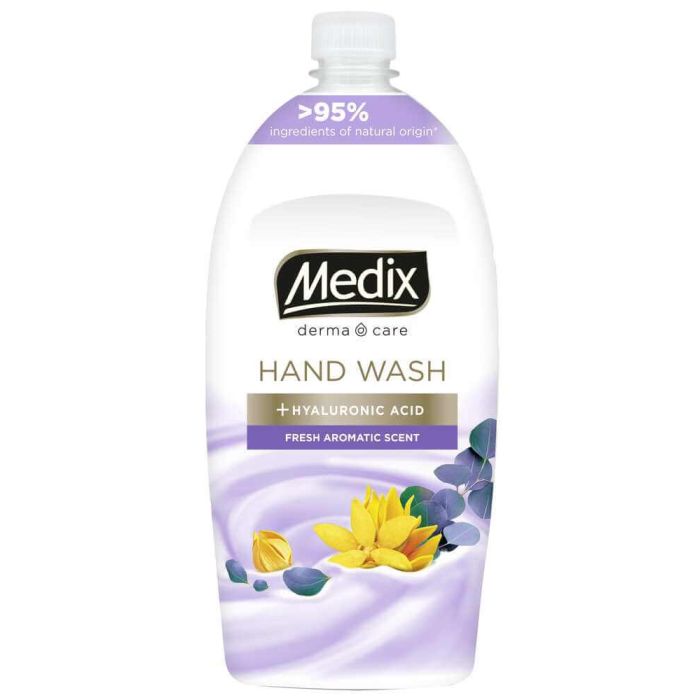 Medix Derma Care Hand Wash Fresh Aromatic Scent е кремообразен течен сапун за ръце с хиалуронова киселина и свеж аромат на цветя. Формулата съдържа комбинация от 7 уникални молекулни тегла на хиалуроновата киселина и овлажняващи съставки за нежна грижа и хидратация. Съставки с над 95% натурален произход. Медикс Дерма Кеър Фреш Ароматик Сент Течен сапун е подходящ за ежедневна употреба.